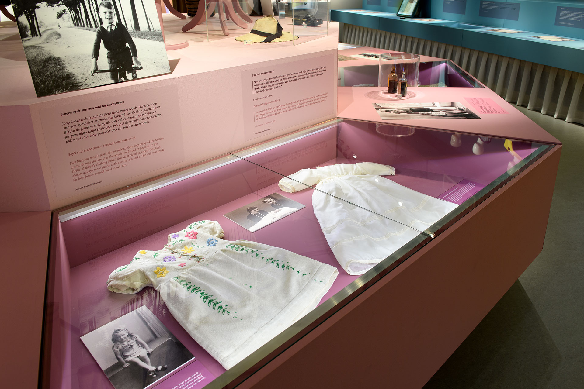 We ontwikkelden een concept waarin de zes hoodfthema’s letterlijk ieder een eigen podium krijgen. De tentoonstelling staat vol met kwetsbare originelen die op veilige afstand worden geplaats door ze op speciaal ontworpen podia te zetten en deze tevens te gebruiken als volumes voor de vitrines. In de pashokjes kun je luisteren naar verhalen over modehuizen of voelen aan bijzondere stoffen zoals een sjaal van hondenhaar.